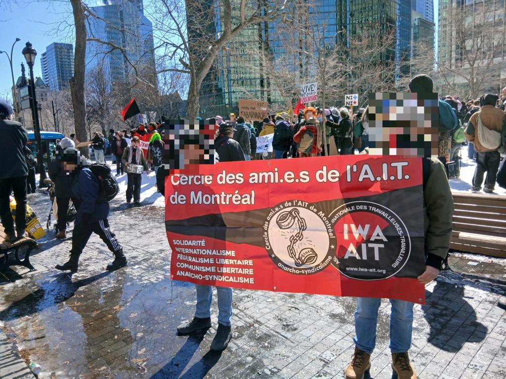 Le Cercle des ami.e.s de l’AIT de Montréal étaient présent.e.s lors de la manifestation de la CRUES du 27 mars Photo: Cercle des ami.e.s de l’AIT de Montréal