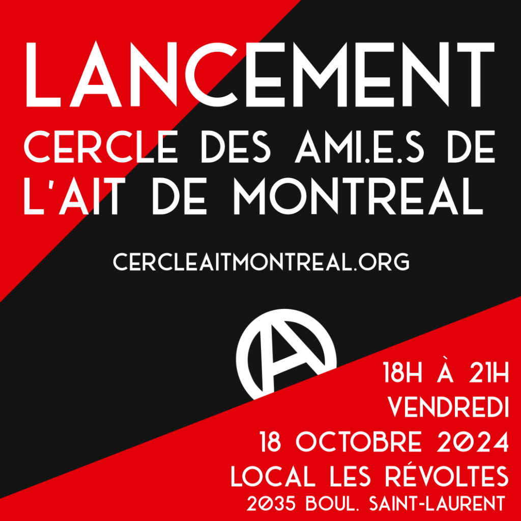 Fondé à l’été 2024, le Cercle des ami.e.s de l’AIT de Montréal a été officiellement reconnu comme l’ ‘initiative canadienne’ par l’Association Internationale des Travailleuses-travailleurs une fédération internationale fondée en 1922 à Berlin. Celle-ci regroupe de nos jours une vingtaine d’organisations anarcho-syndicalistes à travers le monde.