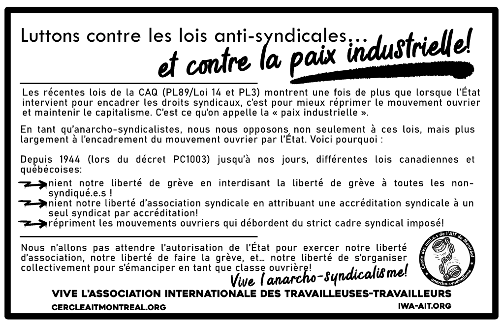 Les récentes lois de la CAQ (PL89/Loi 14 et PL3) montrent une fois de plus que lorsque l’État intervient pour encadrer les droits syndicaux, c’est pour mieux réprimer le mouvement ouvrier et maintenir le capitalisme. C’est ce qu’on appelle la « paix industrielle ».